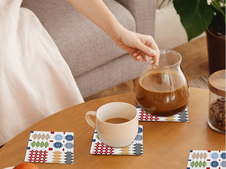 Celebrate the rich heritage of Wales with our Multi-Coloured Welsh Tapestry Blanket Print Design Ceramic Coasters, exclusively from Moose & Co.
