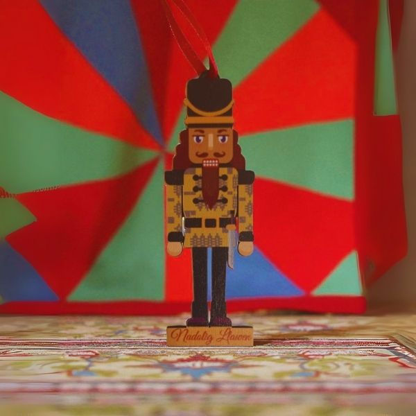 Celebrate the festive season with this enchanting  nutcracker Christmas decorations, printed onto sustainably sourced birch plywood and finished with festive red ribbon– featuring the Welsh tapestry design perfect for traditional holiday displays.